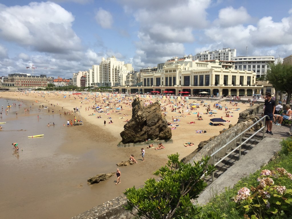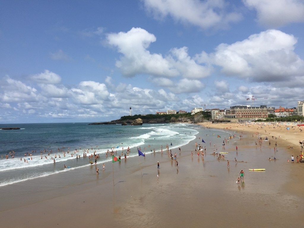 Nuances de bleu vert turquoise, blancs moutons et gris pastel, blondeur du sable, château d’Ilbarritz toujours mystérieux sur sa colline, Rocher de la Vierge et autres rocs posés comme autant de sentinelles, des deux jumeaux aux autres, gardiens des plages surmontées de phares tout aussi placides, tandis que les estivants prennent d’assaut les bords de la promenade, optent pour le petit train touristique ou les navettes pour sillonner la ville, flânent dans les ruelles et se posent aux terrasses du Casino ou du Royalty pour se désaltérer et mieux apprécier la profusion des sensations en suites multiples égrenées le long du parcours.